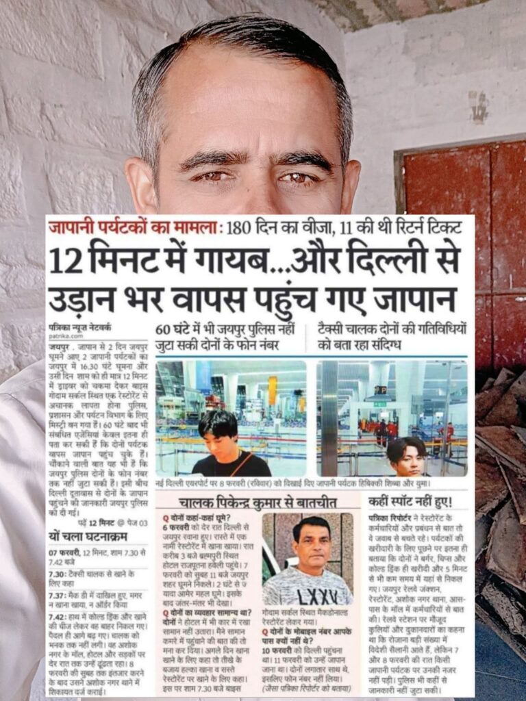 जयपुर. जापान से 2 दिन जयपुर घूमने आए 2 जापानी पर्यटकों का जयपुर में 16.30 घंटे घूमना और उसी दिन शाम को ही मात्र 12 मिनट में ड्राइवर को चकमा देकर बाइस गोदाम सर्कल स्थित एक रेस्टोरेंट से अचानक लापता होना पुलिस, प्रशासन और पर्यटन विभाग के लिए मिस्ट्री बन गया है। 60 घंटे बाद भी संबधित एजेंसियां केवल इतना ही पता कर सकी हैं कि दोनों पर्यटक वापस जापान पहुंच चुके हैं। चौंकाने वाली बात यह भी है कि जयपुर पुलिस दोनों के फोन नंबर तक नहीं जुटा सकी है। इसी बीच दिल्ली दूतावास से दोनों के जापान पहुंचने की जानकारी जयपुर पुलिस को दी गई।