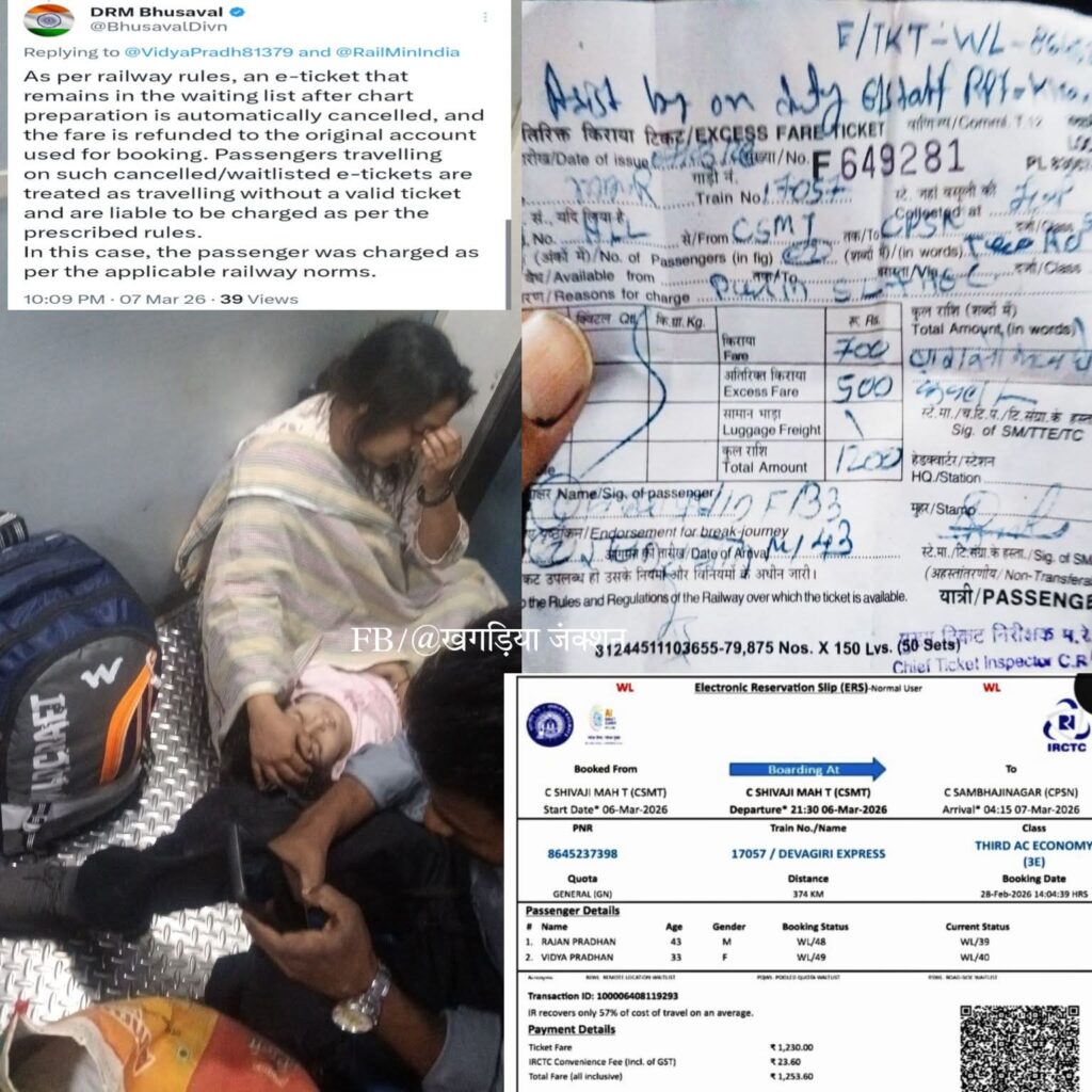 इस संबंध में भुसावल डिवीजन द्वारा स्पष्टीकरण दिया गया कि रेलवे नियम के अनुसार, यदि चार्ट बनने के बाद ई-टिकट वेटिंग में रह जाता है तो वह स्वतः रद्द हो जाता है और किराया यात्री के बैंक खाते में वापस कर दिया जाता है। ऐसे में उस टिकट पर यात्रा करने वाले यात्रियों को बिना वैध टिकट माना जाता है और नियमों के अनुसार उनसे शुल्क लिया जा सकता है। इस मामले में भी यात्री से रेलवे नियमों के तहत शुल्क लिया गया।