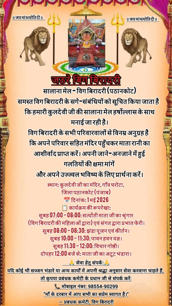 सुशील शंकर विग एडिटर इन चीफ की कलम से विग बिरादरी की सालाना मेल 1मई 2026 को हर साल की तरह इस बार भी होंगी कुलदेवी जी के मंदिर मे डिस्ट्रिक घरौंटा पटनकोट मे होंगी आप अपनाए परिवार के साथ माँ का आशीर्वाद लेने आया और अपनाय और अपनाए परिवार के भविष्य की दुआ मागय               माता जी का मेल सुबह 7 बजाये से विभिन्न कार्यकाराम शुरू हो जायगे और शाम तक चललागे